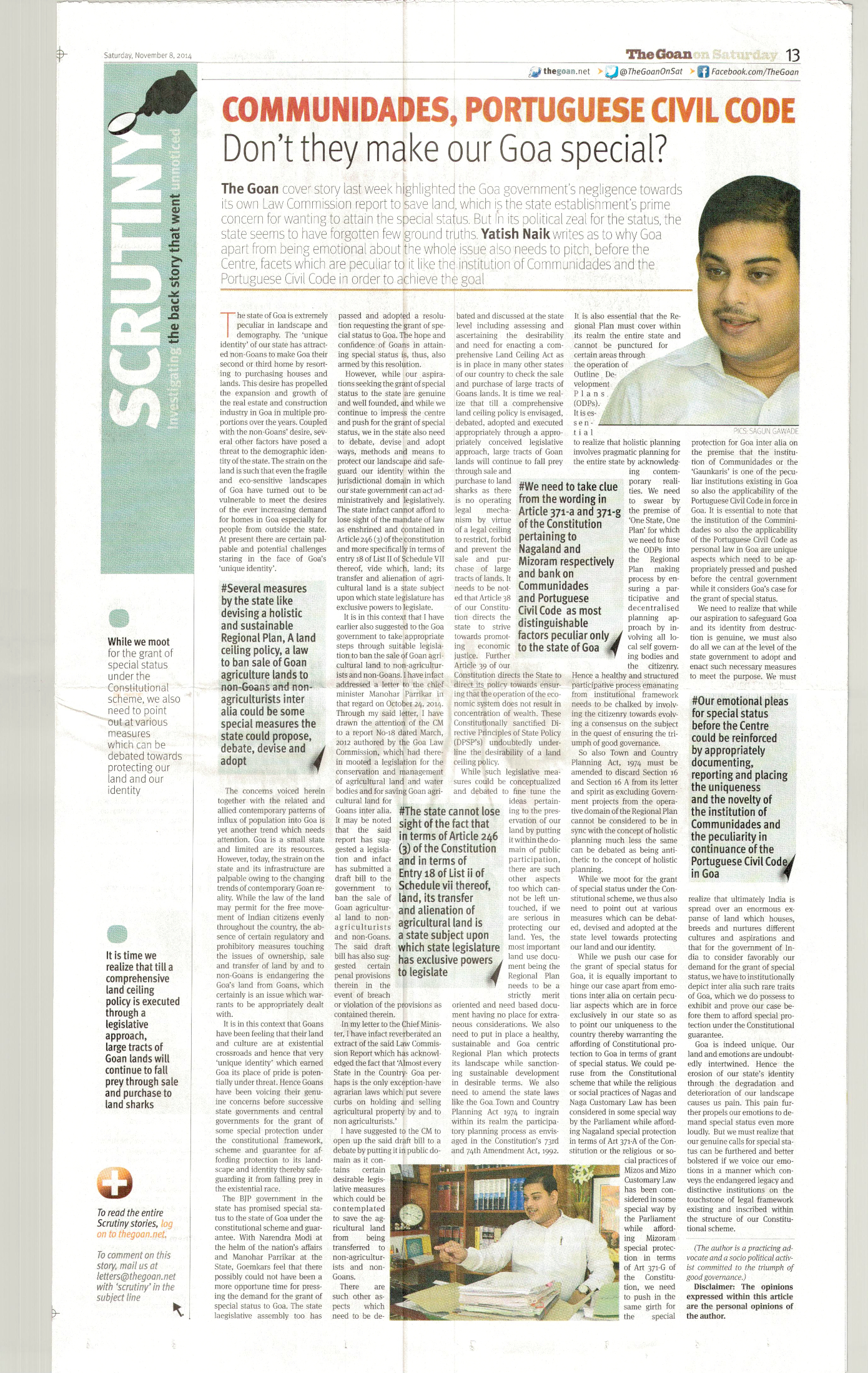 The Goan cover story last week highlighted the Goa government’s negligence towards its own Law Commission report to save land, which is the state establishment’s prime concern for wanting to attain the special status. But In its political zeal for the status, the state seems to have forgotten few ground truths. Yatish Naik writes as to why Goa apart from being emotional about the whole issue also needs to pitch, before the Centre, facets which are peculiar to it like the institution of Communidades and the Portuguese Civil Code in orcer to achieve the goal